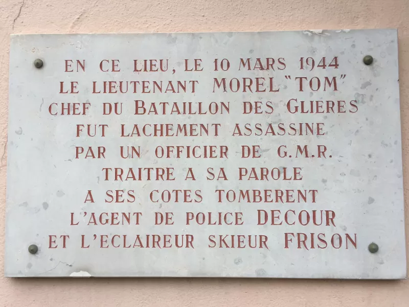 En ce lieu, le 10 mars 1944 le Lieutenant Morel "Tom" chef du bataillon des Glières fut lâchement assassiné par un officier de G.M.R. traître à sa parole