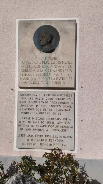 À la mémoire du révérend Père Louis Favre professeur en cette maison arrêté par les allemands le 3 février 1944 fusillé le 16 juillet pour avoir servi la patrie et sauver des malheureux.