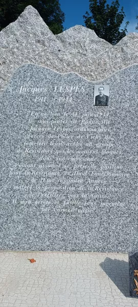 "En ce lieu le 14 juin 1944, le sous-préfet de Bonneville Jacques Lespès ordonna aux forces de Police de Vichy de remettre leurs armes au groupe de Résistants qui les avaient bloqués dans une embuscade.